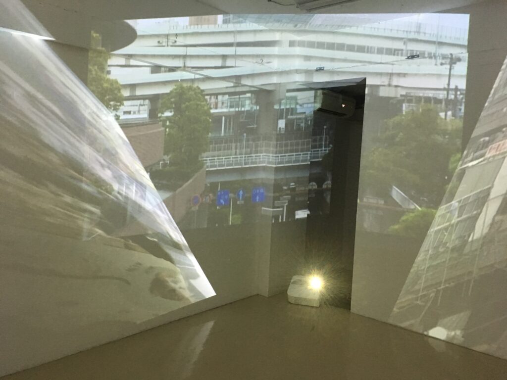 Osamu Kanemura’s video installation, the latest movie work, Shrimp Cocktail President, was shown using three projectors on every wall of the gallery.