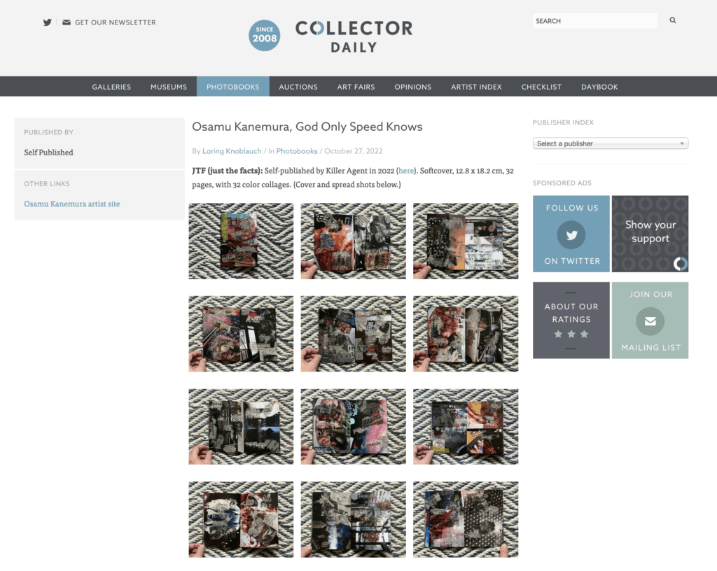A booklet with the same title as the exhibition title, “God Only Speed Knows,” made from collages of color digital prints, was published in conjunction with the exhibition by Kanamura’s label, KILLER AGENT.